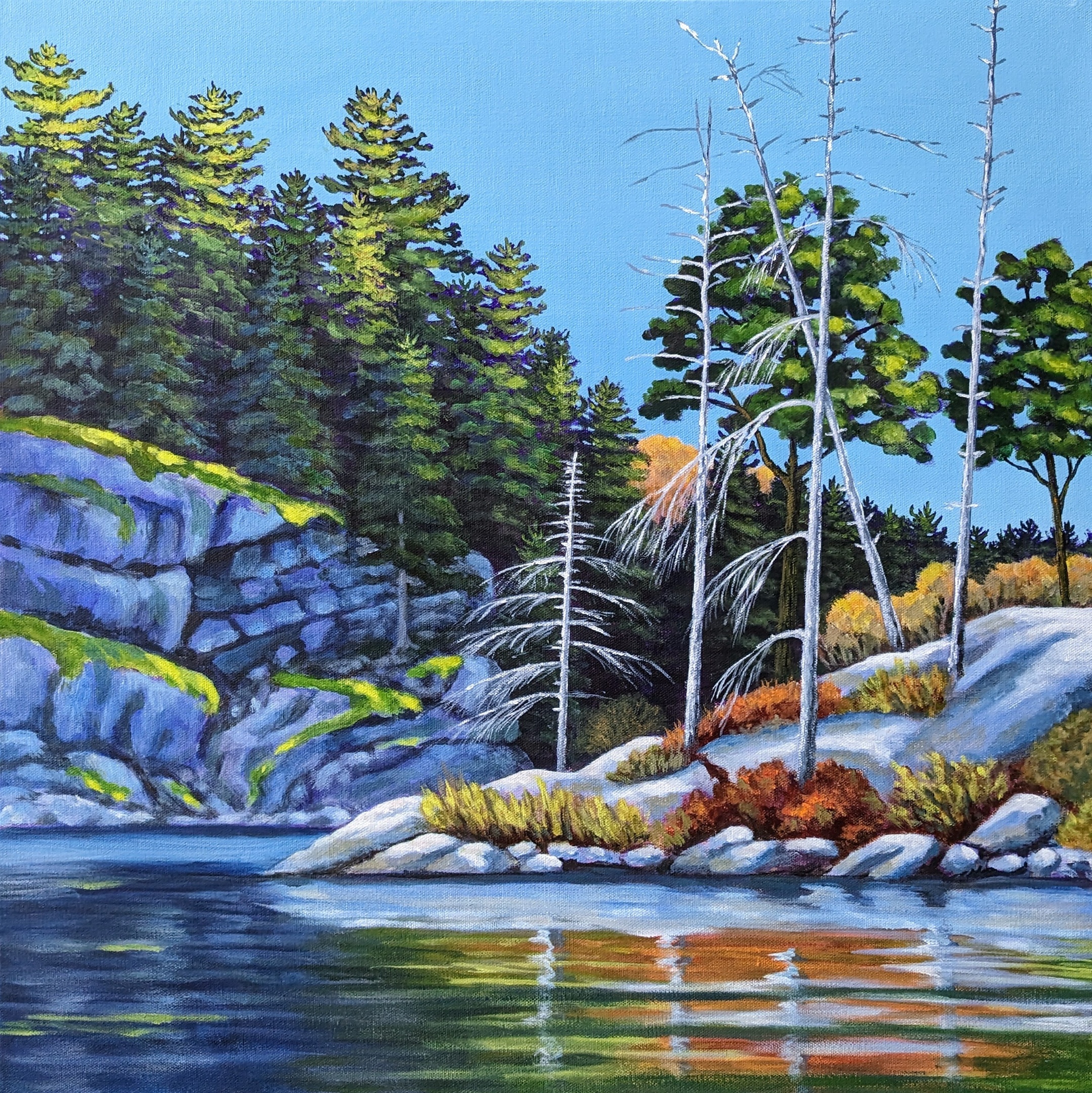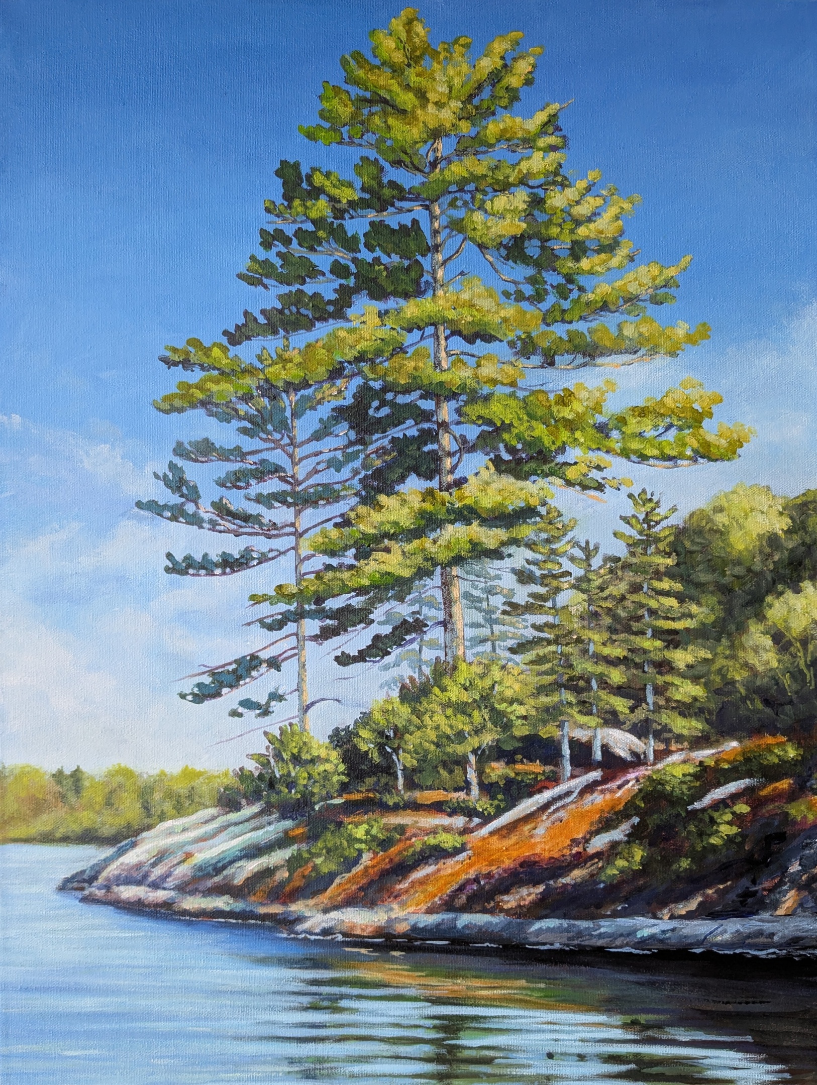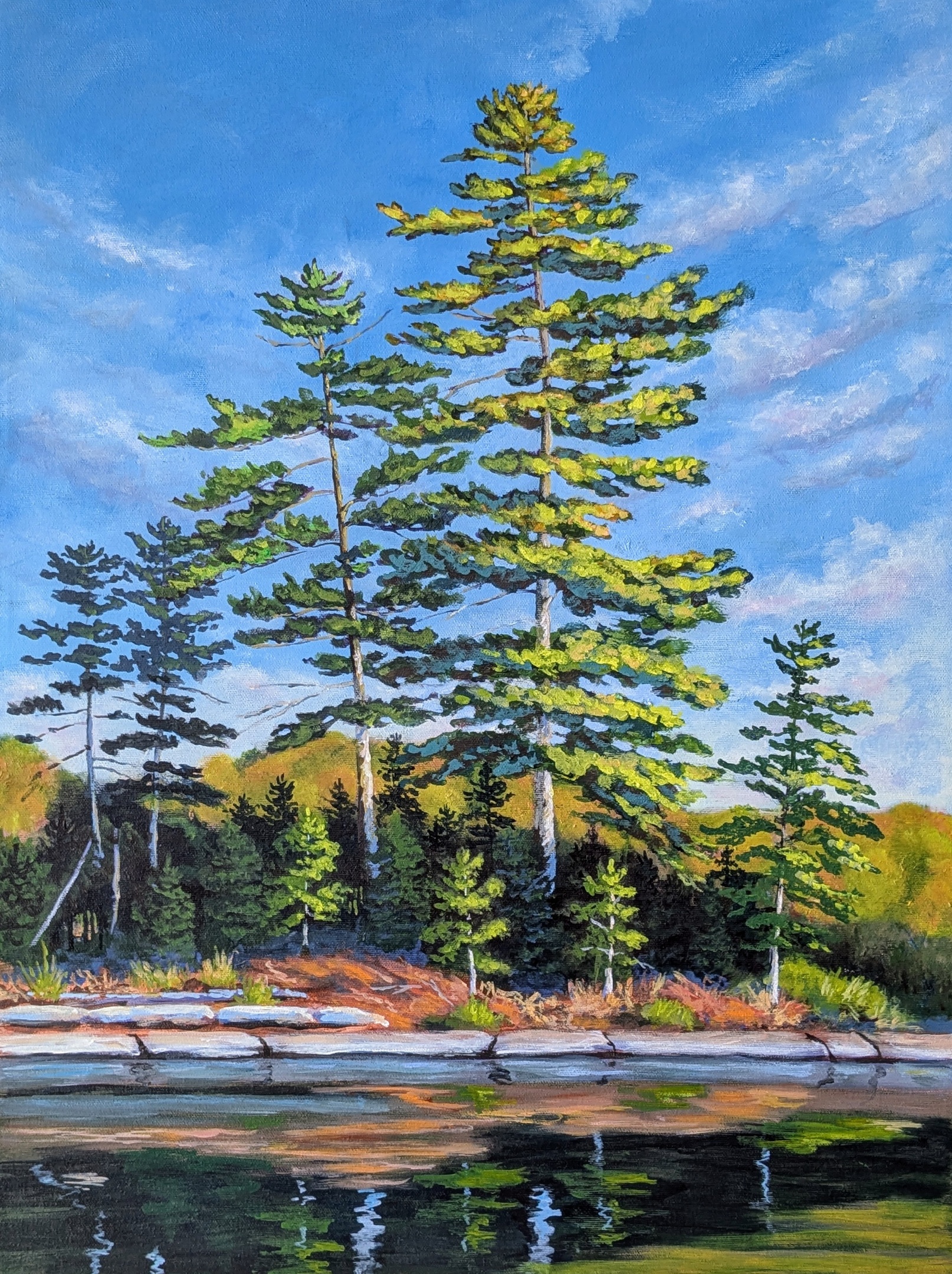 Black Spruce say Algonquin to me. Here they are in a stand with a couple of fine Pine specimens, surrounded by calm marsh waters dotted with lily pads. If I listen carefully, I can almost hear the Bull Frogs