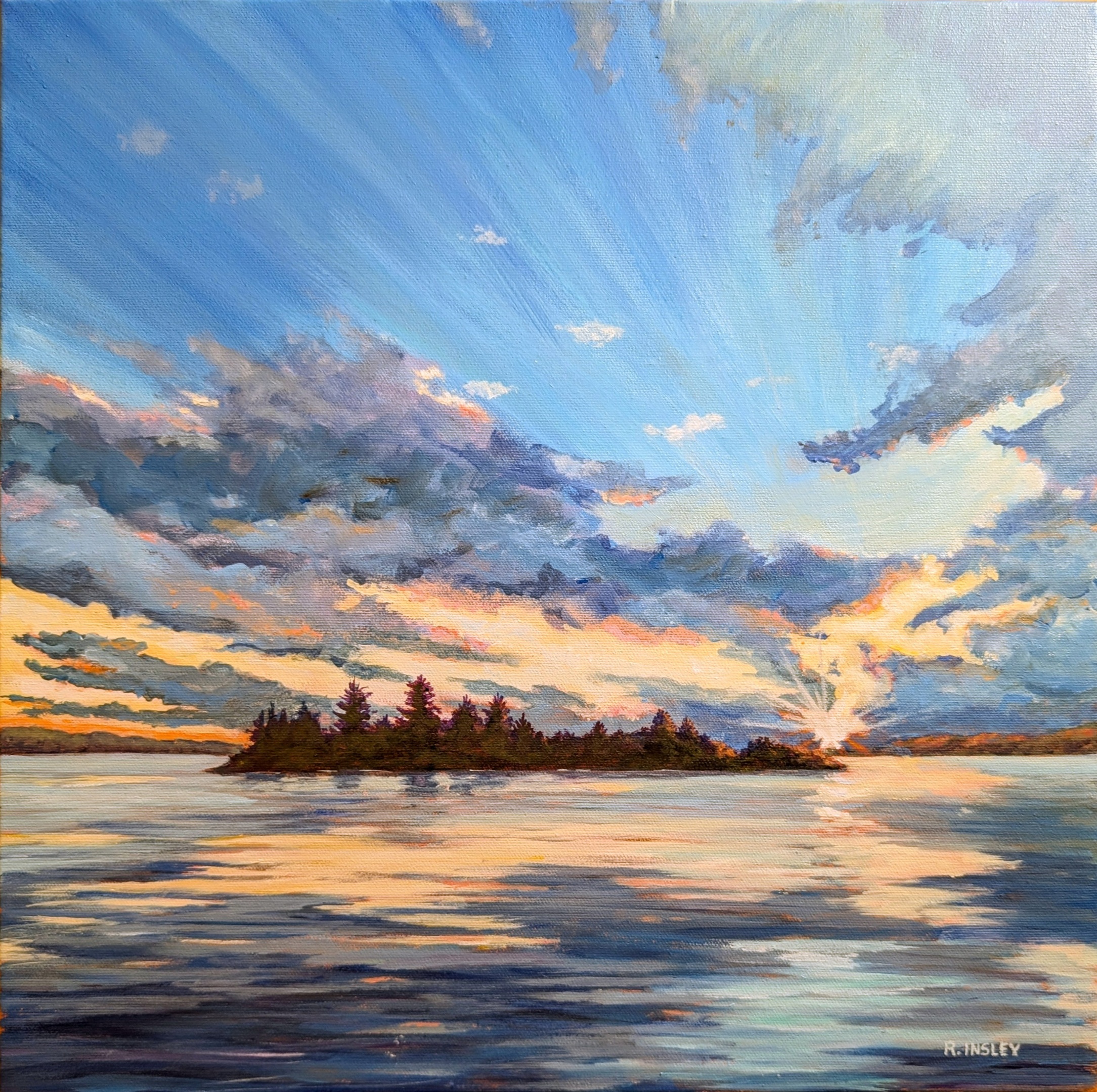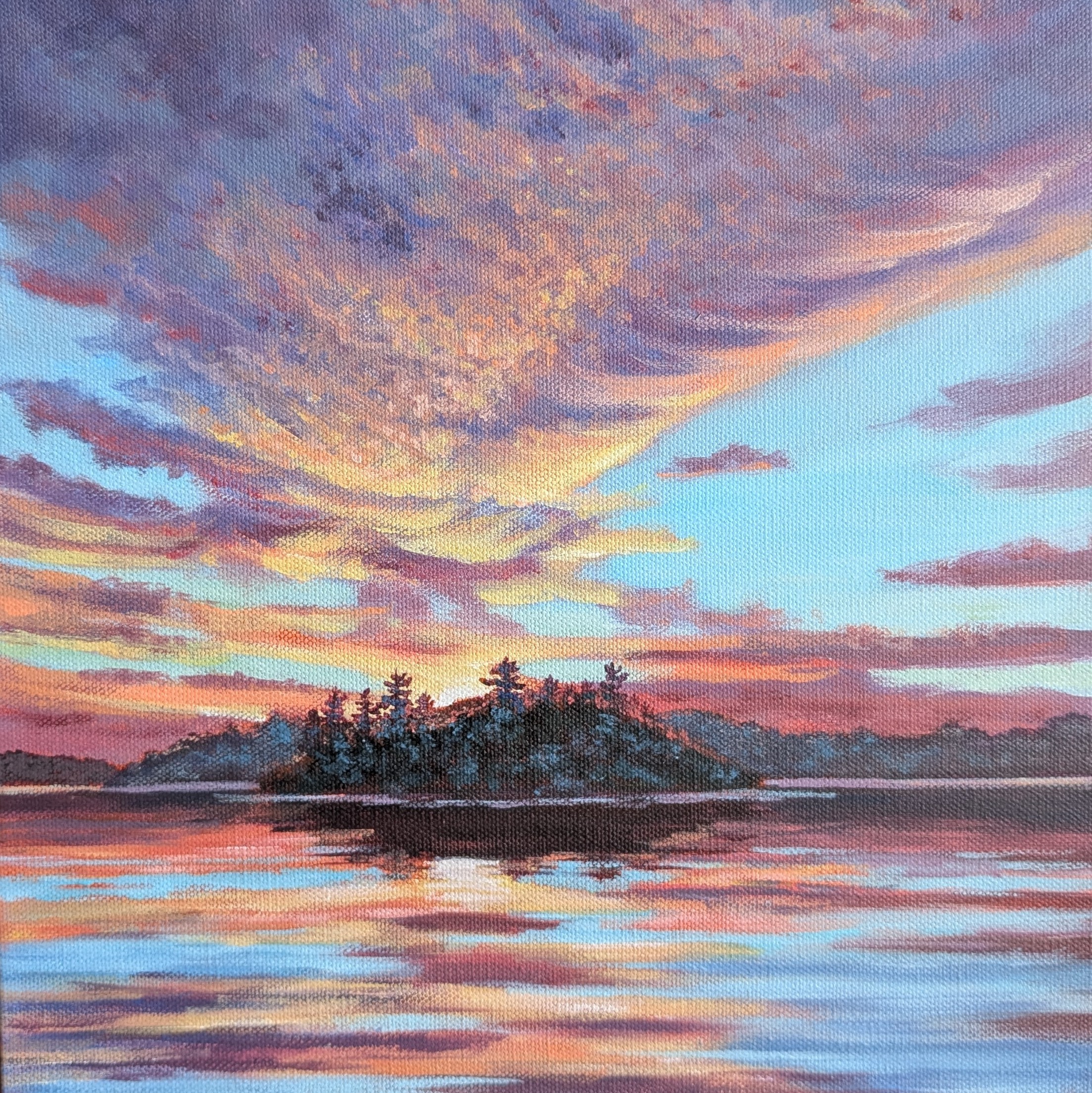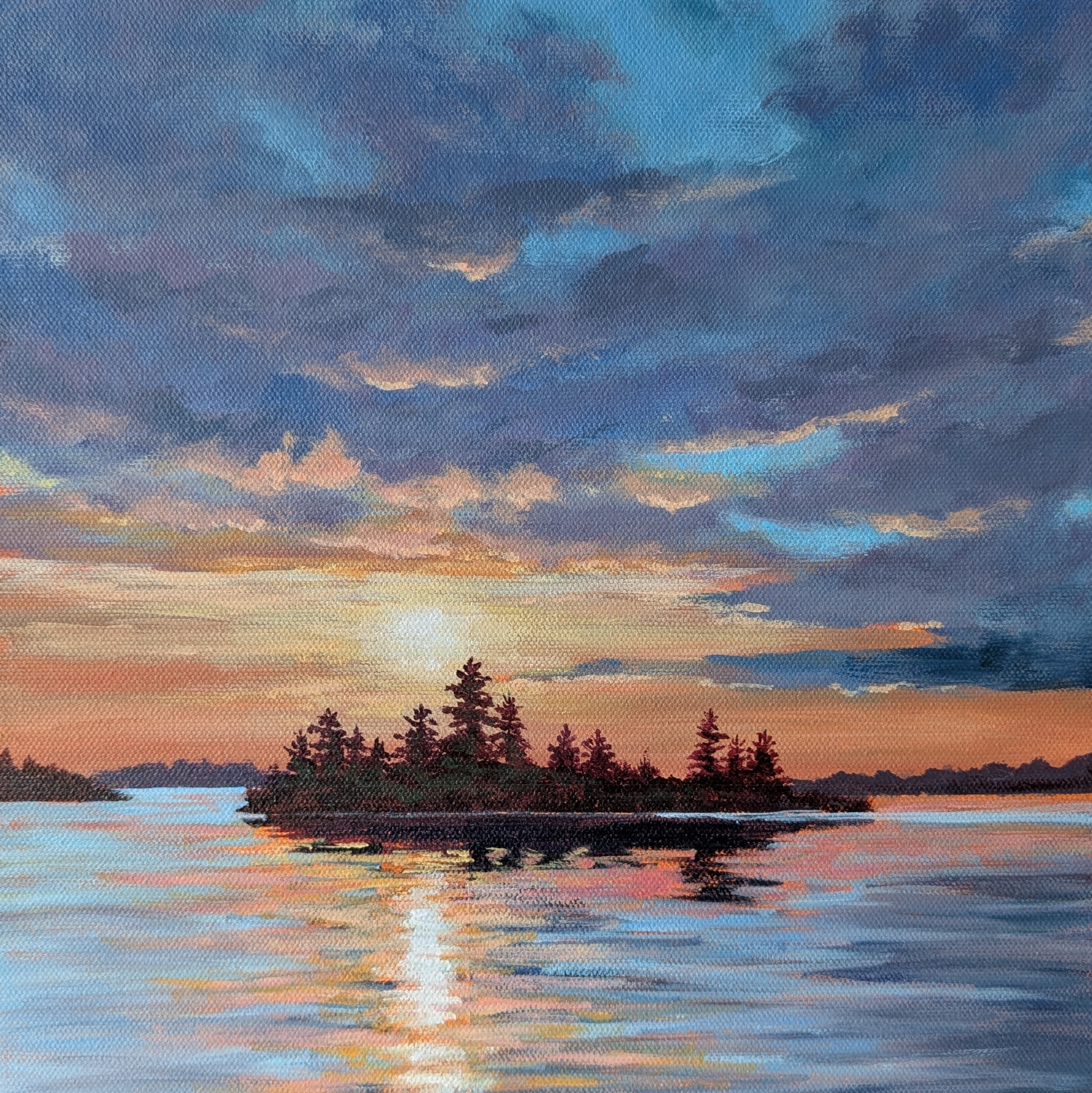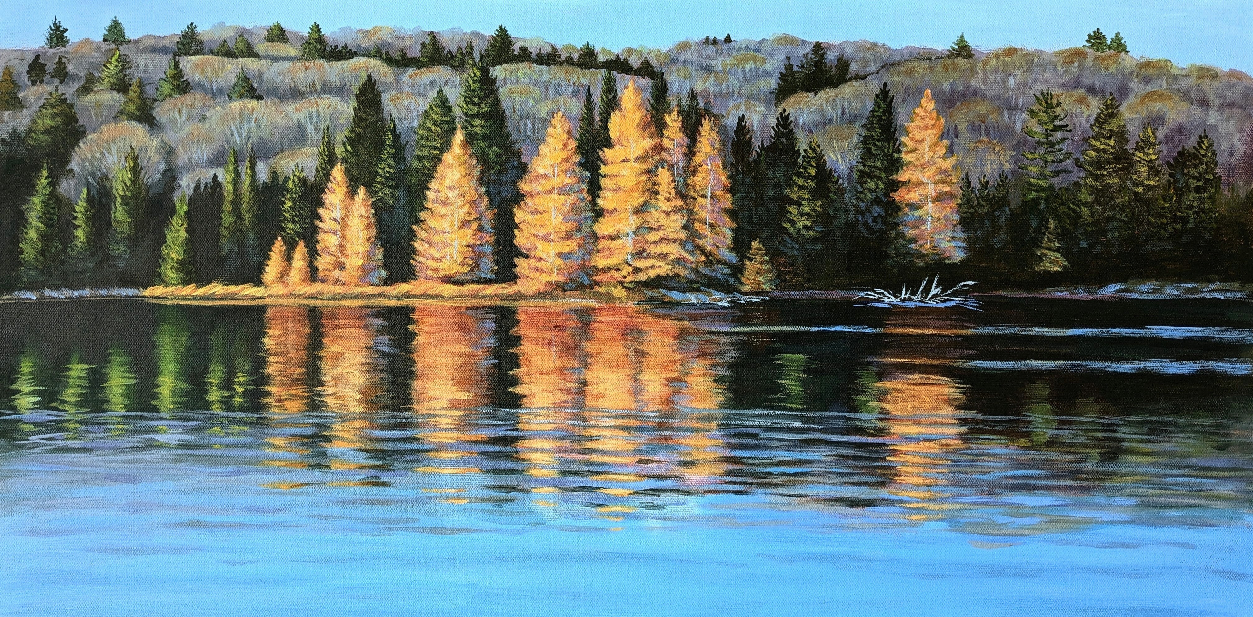 Another late day painting. I love how the light just caresses the treetops, but sets the far shore ablaze! And the deep shadows are so dramatic.!