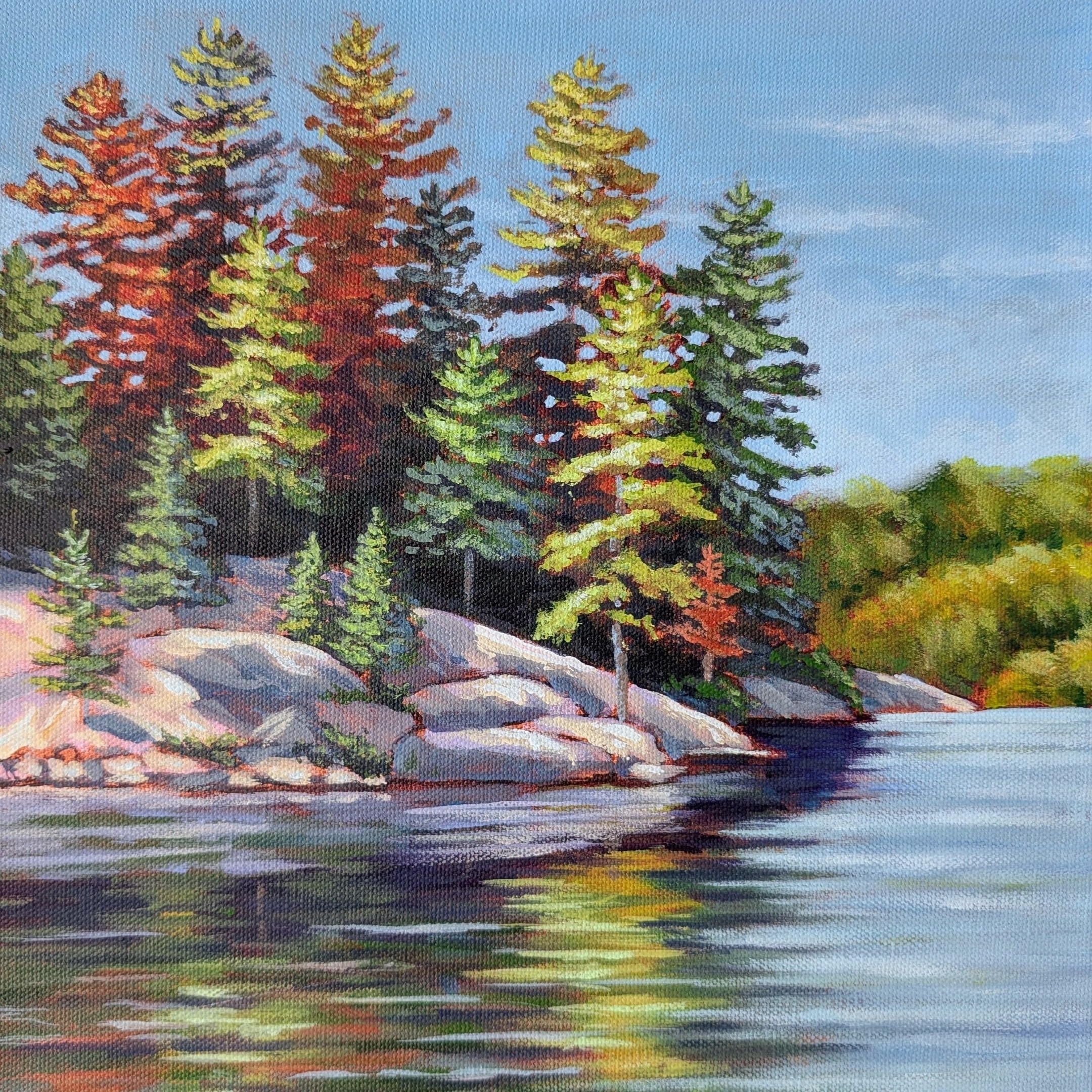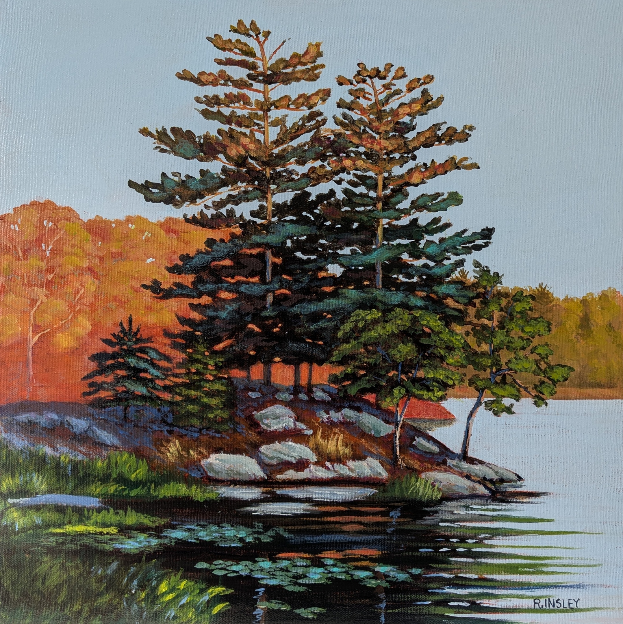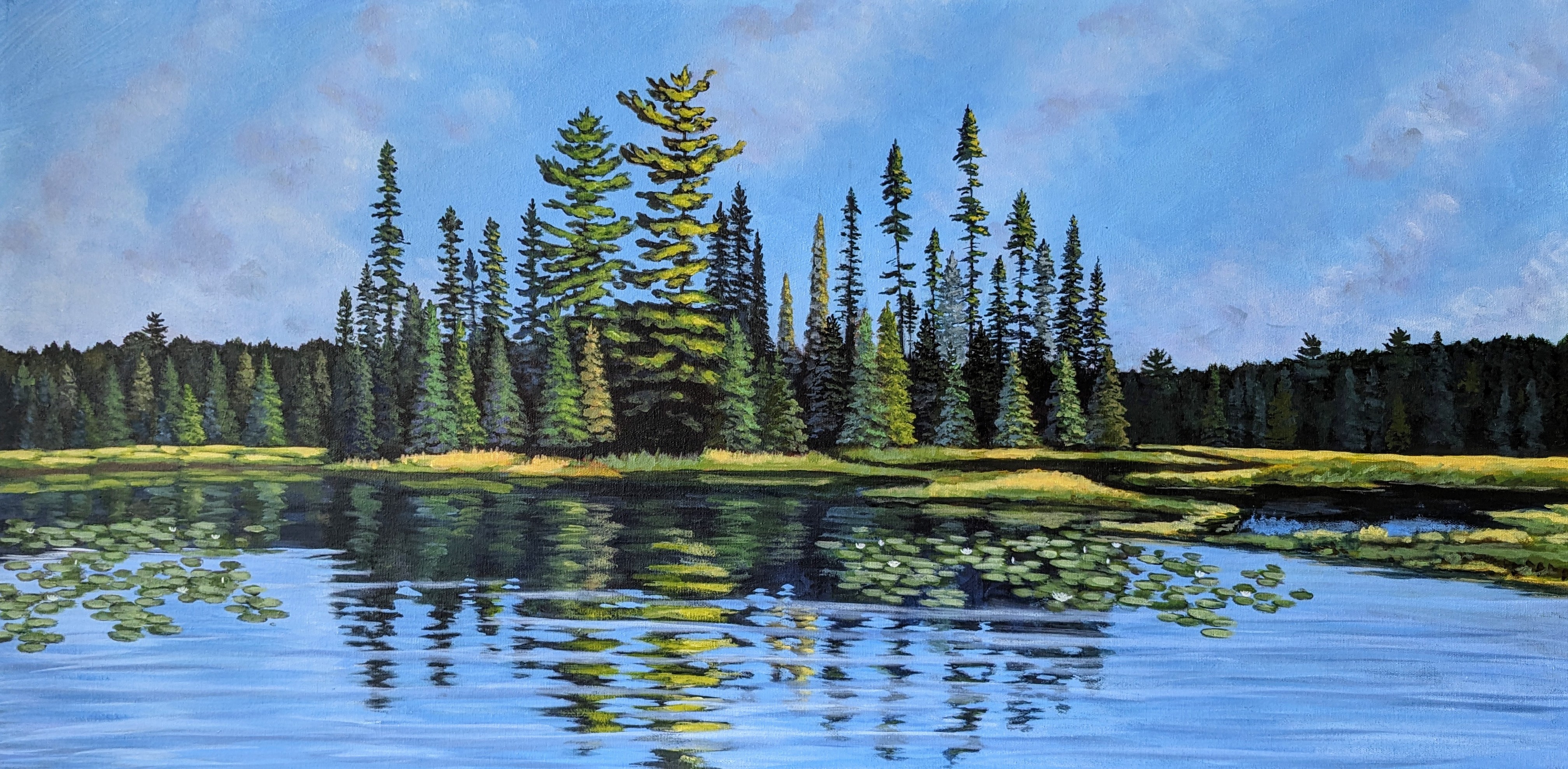 Black Spruce say Algonquin to me. Here they are in a stand with a couple of fine Pine specimens, surrounded by calm marsh waters dotted with lily pads. If I listen carefully, I can almost hear the Bull Frogs