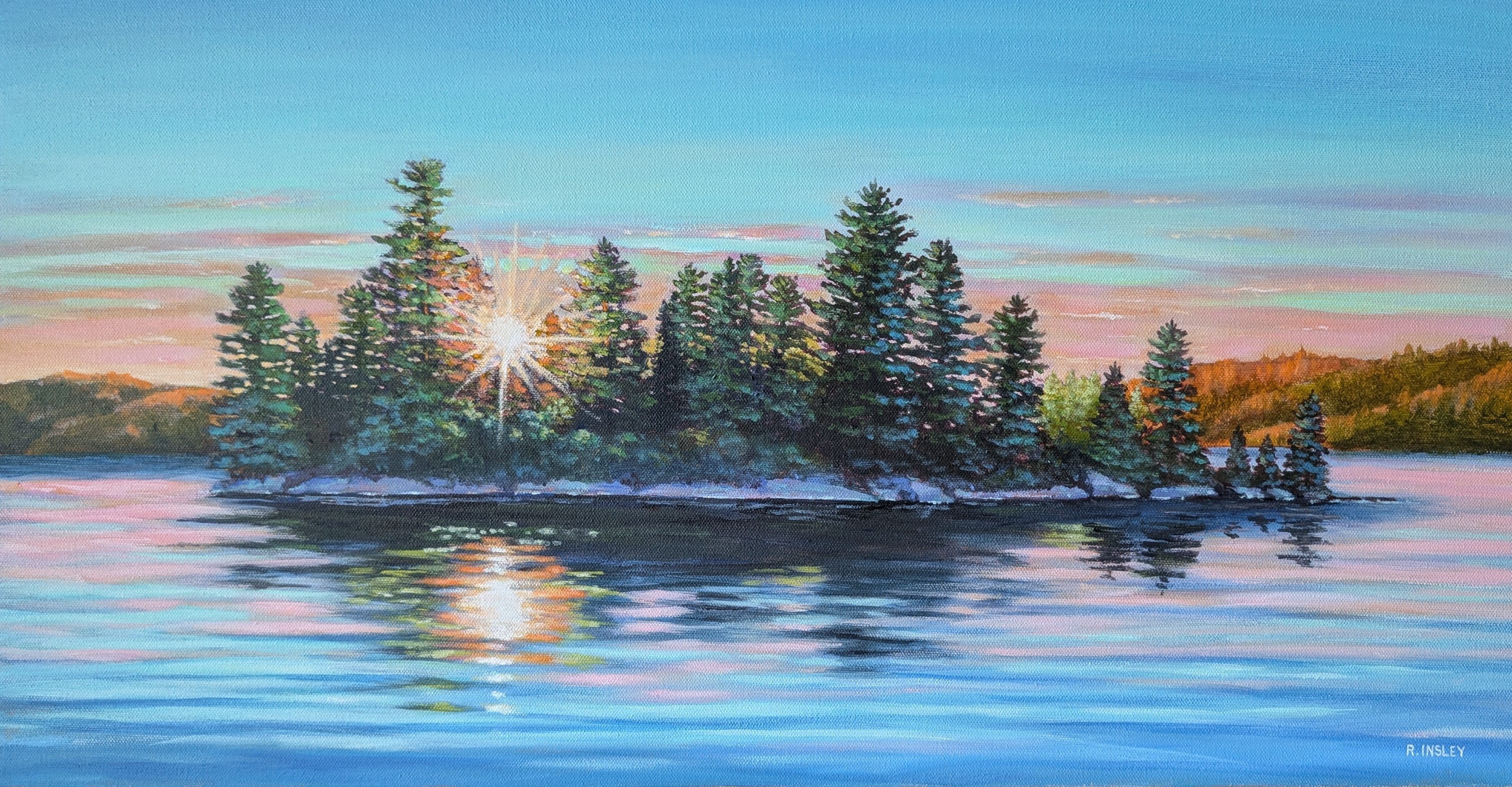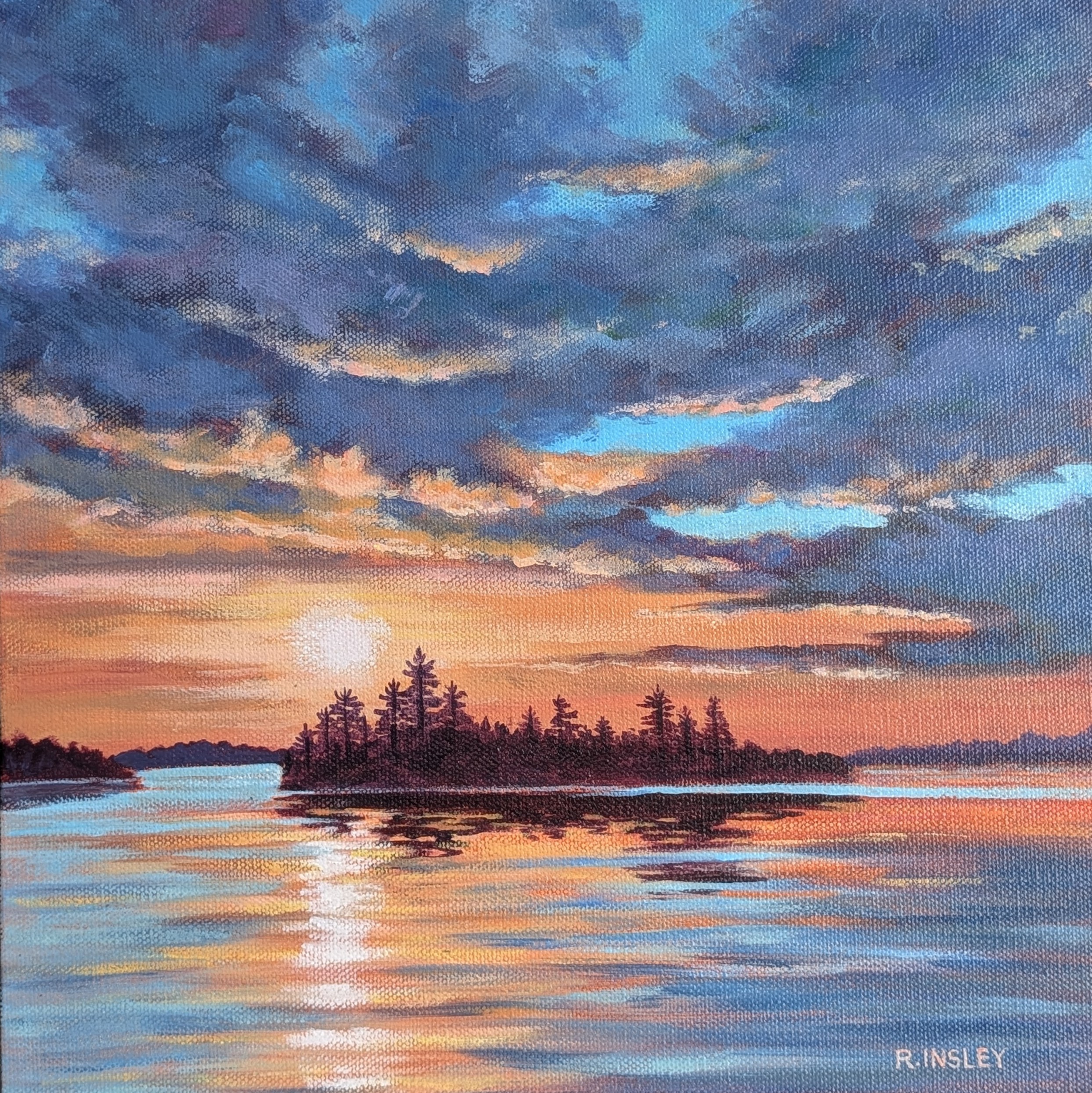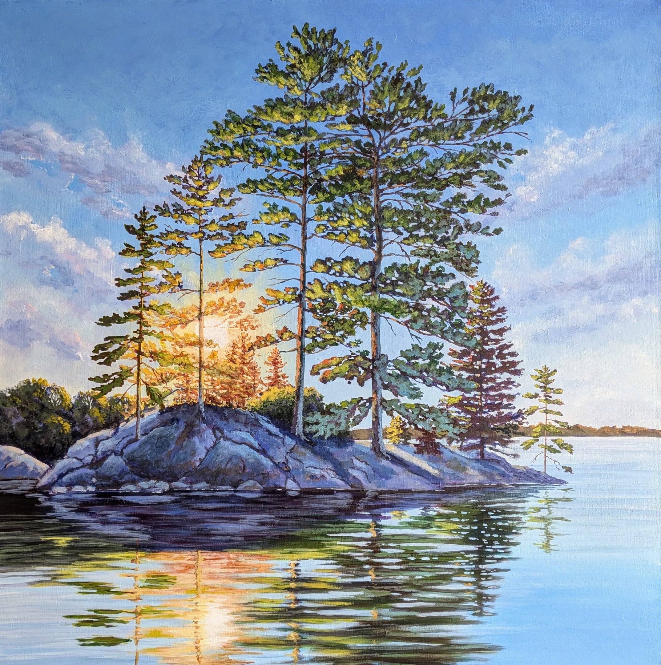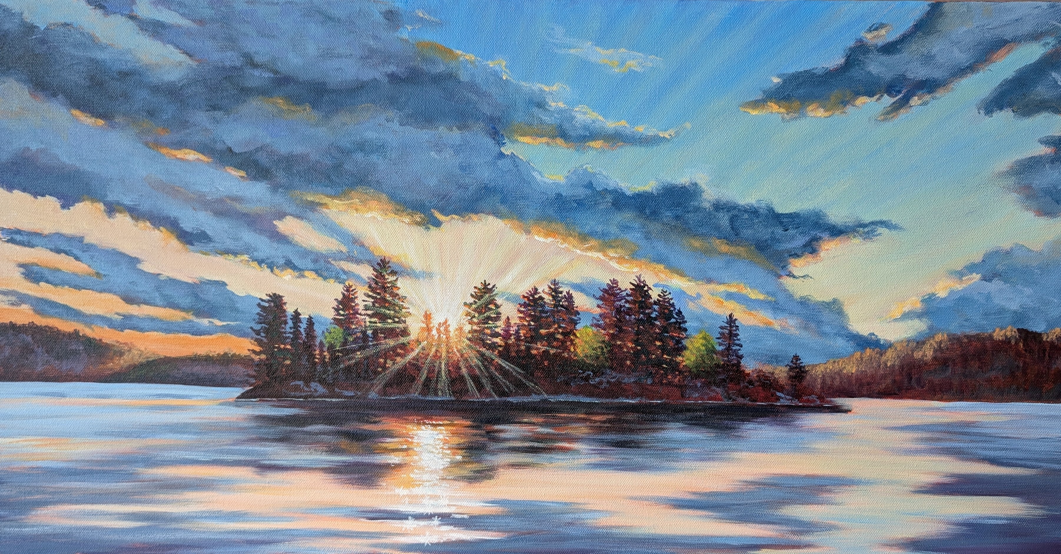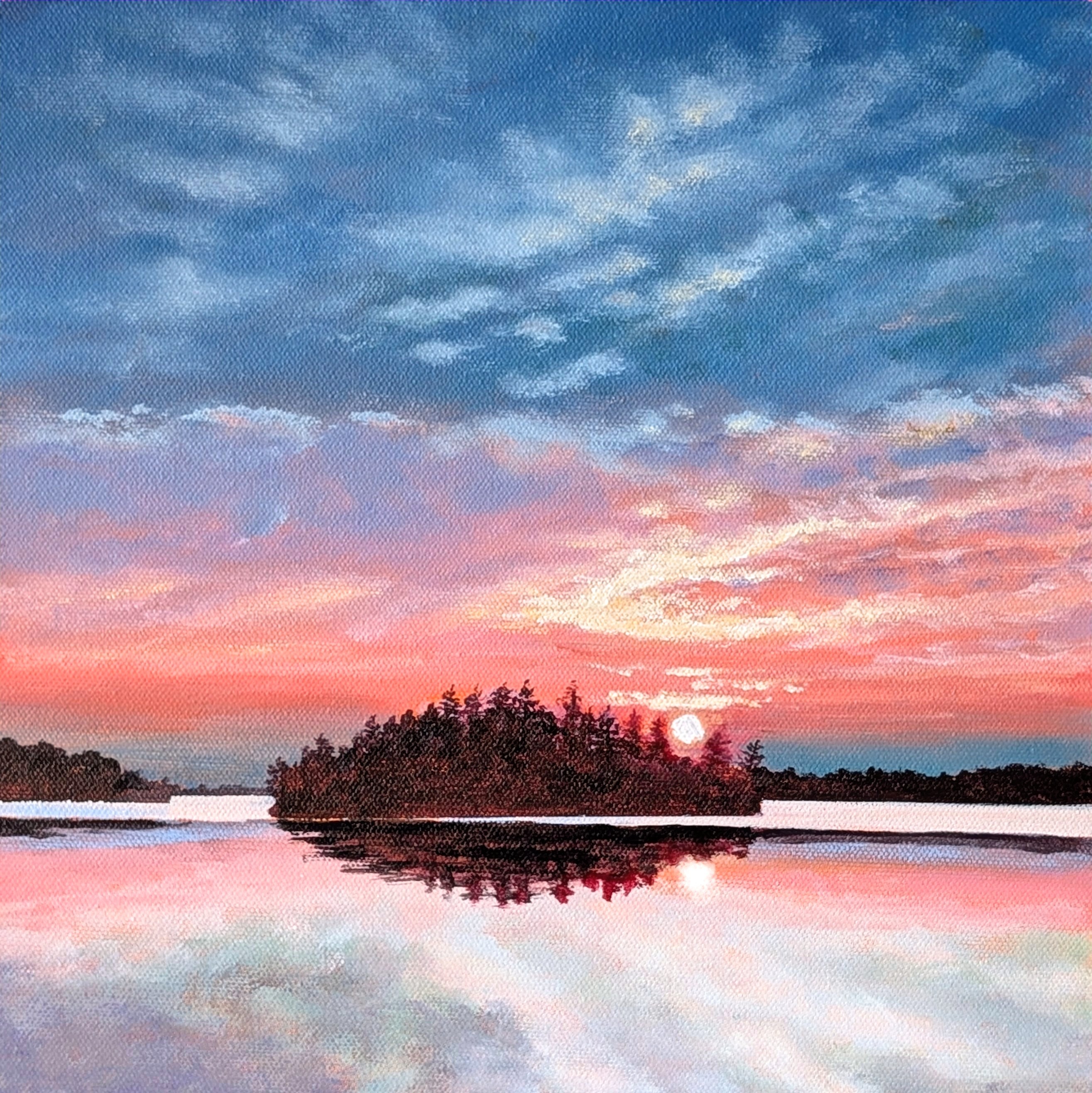 Another late day painting. I love how the light just caresses the treetops, but sets the far shore ablaze! And the deep shadows are so dramatic.!